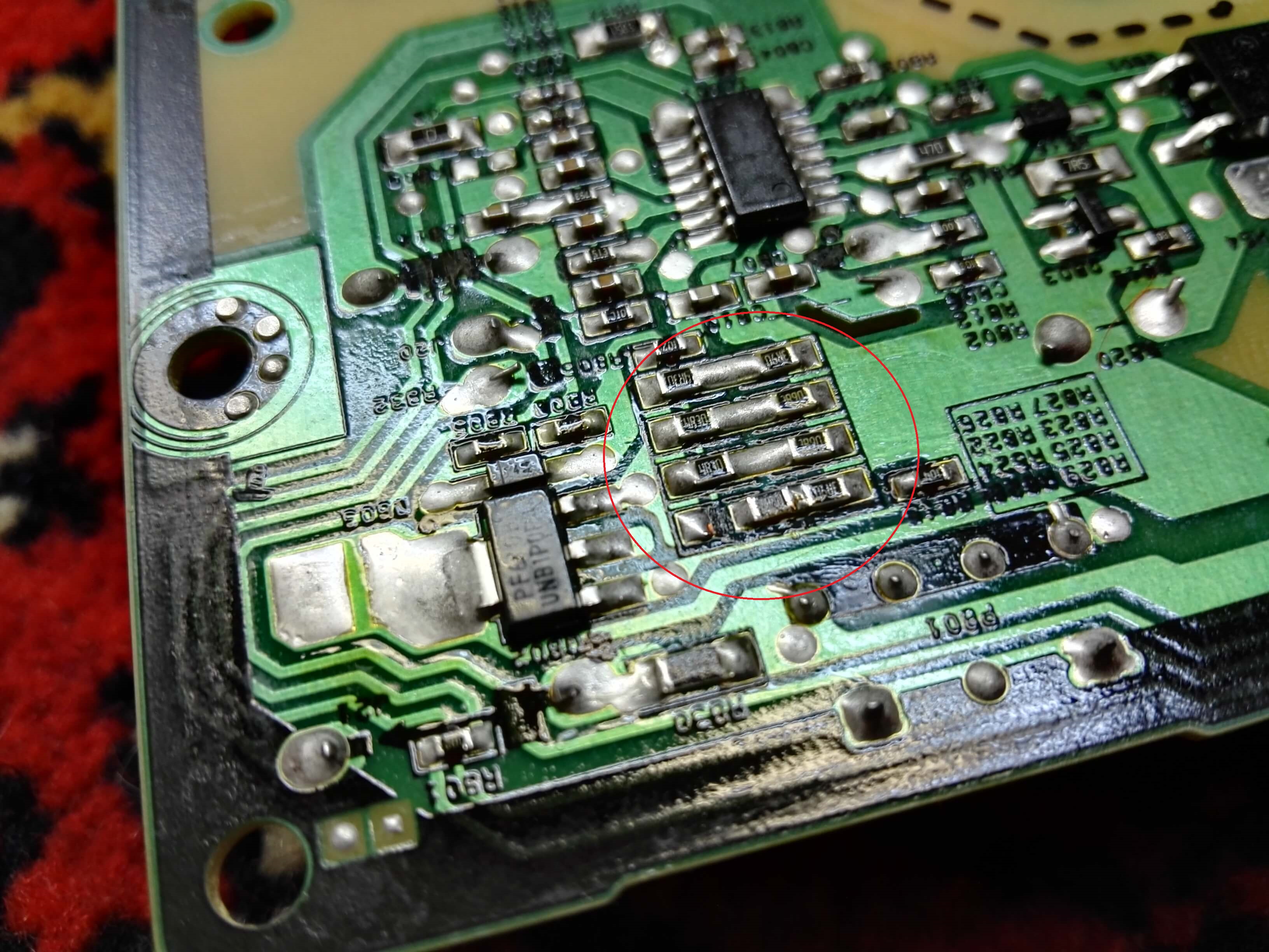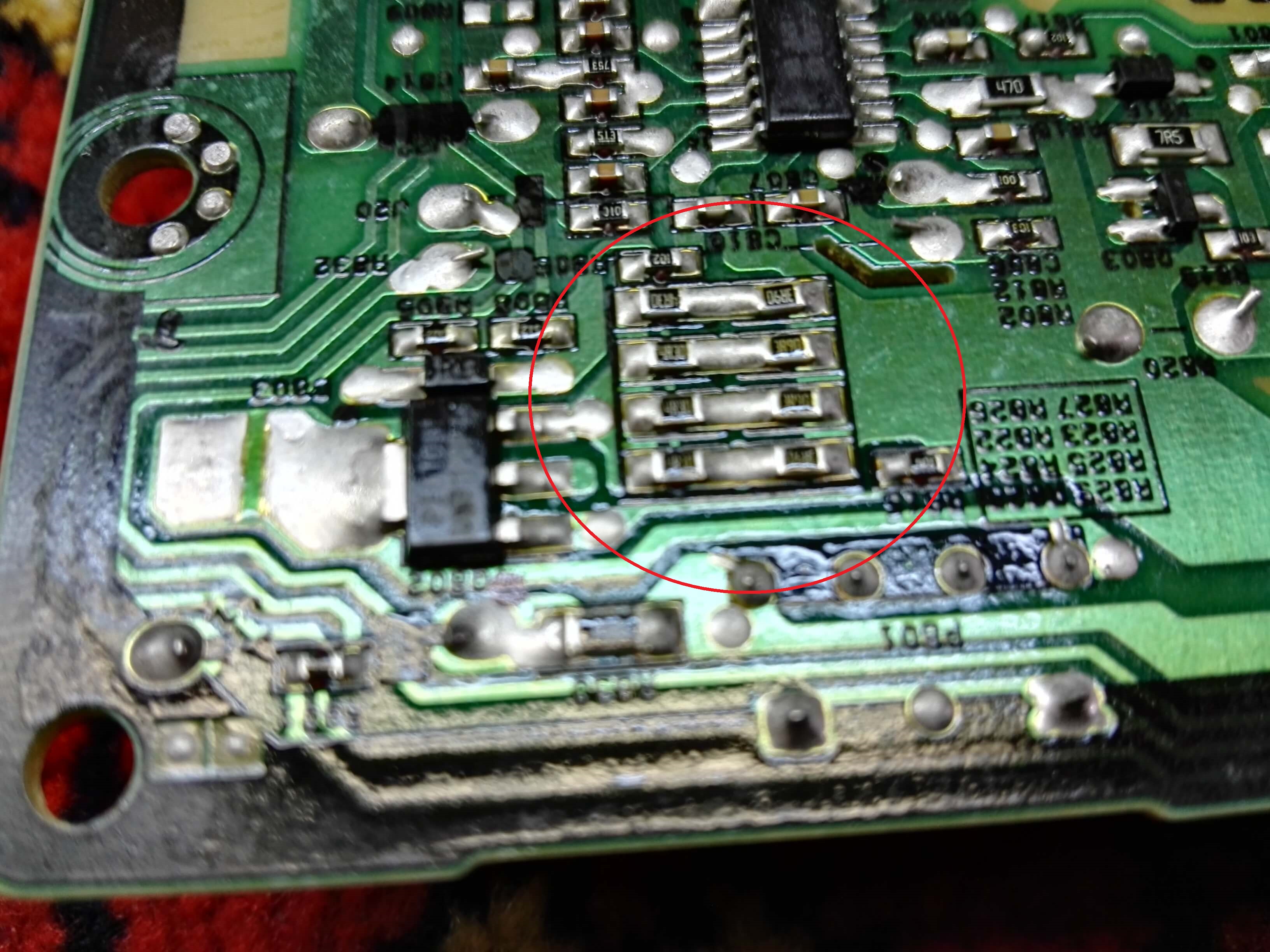 Найдите группу резисторов обведенных красным кольцом на фотографии. Она находится с обратной стороны блока.